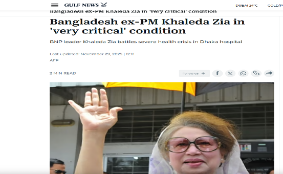 বিএনপি চেয়ারপারসন ও সাবেক প্রধানমন্ত্রী খালেদা জিয়া গুরুতর অসুস্থ হয়ে রাজধানীর এভারকেয়ার হাসপাতালে চিকিৎসাধীন। তার এই ‘সংকটাপন্ন’ শারীরিক অবস্থা নিয়ে প্রতিবেদন প্রকাশ করেছে বিভিন্ন আন্তর্জাতিক গণমাধ্যম।
