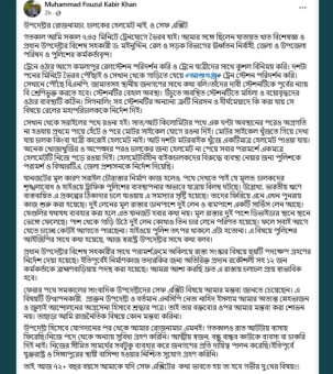মুহাম্মদ ফাওজুল কবির খান লিখেন, ‘গতকাল আমি সকাল ৭টা ৪৫ মিনিটে ট্রেনযোগে ভৈরব যাই। আমার সঙ্গে ছিলেন যাতায়াত খাত বিশেষজ্ঞ ও প্রধান উপদেষ্টার বিশেষ সহকারী ড. মইনুদ্দিন, রেল ও সড়ক বিভাগের ঊর্ধ্বতন নির্বাহী, জেলা ও উপজেলা পরিষদ ও পুলিশের কর্মকর্তাবৃন্দ।’