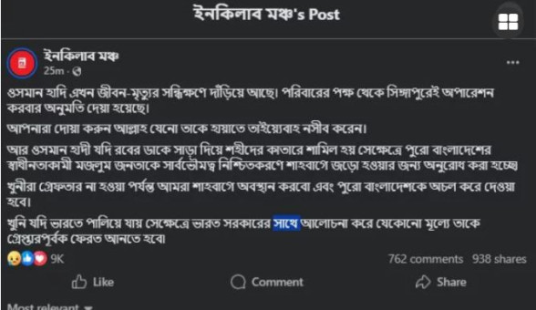 পোস্টে বলা হয়েছে, ওসমান হাদি এখন জীবন-মৃত্যুর সন্ধিক্ষণে দাঁড়িয়ে আছে। পরিবারের পক্ষ থেকে সিঙ্গাপুরেই অপারেশন করবার অনুমতি দেওয়া হয়েছে। আপনারা দোয়া করুন আল্লাহ যেনো তাকে হায়াতে তাইয়্যেবাহ নসীব করেন।