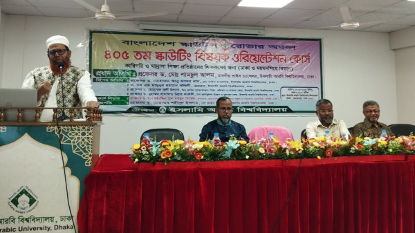 সোমবার (১৮ আগস্ট) বিকেলে ইসলামি আরবি বিশ্ববিদ্যালয়ের মিলনায়তনে বিশ্ববিদ্যালয়ের সার্বিক ব্যবস্থাপনায় বাংলাদেশ স্কাউট রোভার অঞ্চলের অর্থায়নে ঢাকা ও ময়মনসিংহ বিভাগ এর ইসলামি আরবি বিশ্ববিদ্যালয় অধিভুক্ত ফাজিল ও কামিল মাদরাসা এবং কারিগরি ও মাদরাসা শিক্ষাপ্রতিষ্টানের শিক্ষকদের জন্য দিনব্যাপী ৪০৬তম স্কাউটিং ওরিয়েন্টশেন কোর্স ও সনদ প্রদান অনুষ্টানে প্রধান অতিথির বক্তব্যে তিনি এসব কথা বলেন।