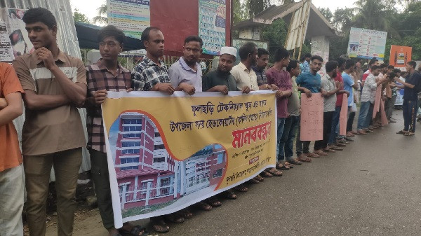 গাইবান্ধার ফুলছড়িতে প্রস্তাবিত সরকারি টেকনিক্যাল স্কুল ও কলেজ স্থাপনের দাবিতে মানববন্ধন কর্মসূচি পালন করেছে স্থানীয়রা।