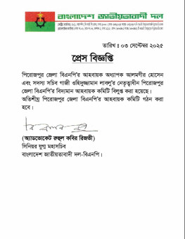 বিএনপির সিনিয়র যুগ্ম মহাসচিব অ্যাডভোকেট রুহুল কবির রিজভীর স্বাক্ষরিত এক প্রেস বিজ্ঞপ্তিতে বুধবার (৩ সেপ্টেম্বর) এই তথ্য জানানো হয়।