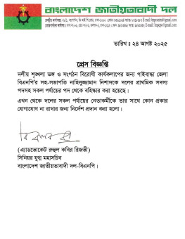 দলীয় শৃঙ্খলা ভঙ্গ ও সংগঠন বিরোধী কার্যকলাপের জন্য গাইবান্ধা জেলা বিএনপি'র সহ-সভাপতি নাহিদুজ্জামান নিশাদকে দলীয় পদ থেকে বহিস্কার করা হয়েছে।