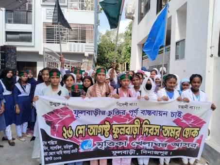 ফুলবাড়ী চুক্তির ৬ দফা পূর্ণাঙ্গ বাস্তবায়নের দাবিতে মাঠে নেমেছে শিশু-কিশোররা। শিশু-কিশোরদের জাতীয় সংগঠন ‘মৃত্তিকা খেলাঘর’ গতকাল মঙ্গলবার দিনাজপুরের ফুলবাড়ী শহরে আলোচনা, সমাবেশ ও র্যালির আয়োজন করে। এতে উপজেলার বিভিন্ন শিক্ষাপ্রতিষ্ঠানের শিক্ষার্থীরা স্বতঃস্ফূর্তভাবে মাথায় জাতীয় পতাকা, বুকে কালো ব্যাচ ধারণ করে র্যালিতে অংশ নেয়। ফুলবাড়ী ট্র্যাজেডি দিবসের আলোচনা শেষে বর্ণাঢ্য র্যালিটি শহরের প্রধান প্রধান সড়ক প্রদক্ষিণ করে। শহীদ স্মৃতিস্তম্ভে পুষ্পার্ঘ্য অর্পণ করে অন্য সংগঠনের নেতাকর্মীরা।