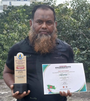 তথ্য উপদেষ্টা মাহফুজ আলমের কাছ থেকে সম্মাননা সনদ গ্রহণ করছেন সাংবাদিক মুসাফির মানিক। জুলাই গণঅভ্যুত্থানে সাহসিকতার সঙ্গে পেশাগত দায়িত্ব পালনের জন্য বাংলাদেশ সাংবাদিক কল্যাণ ট্রাস্টের সম্মাননা পেয়েছেন ভোরের আকাশের ফটো সাংবাদিক মুসাফির মানিক।