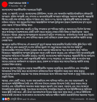 অন্তর্বর্তীকালীন সরকার জানিয়েছে, ফৌজদারি অপরাধে দণ্ডিত পলাতক শেখ হাসিনার অডিও প্রচার আইনত নিষিদ্ধ। কিছু গণমাধ্যম এই নির্দেশ উপেক্ষা করে তার মিথ্যা ও উসকানিমূলক বক্তব্য সম্প্রচার করেছে। কেউ যদি ভবিষ্যতে শেখ হাসিনার বক্তব্য প্রকাশ করে, তবে তাৎক্ষণিক আইনি ব্যবস্থা নেওয়া হবে, কারণ এটি দেশে অস্থিতিশীলতা ও সহিংসতা উসকে দিতে পারে।