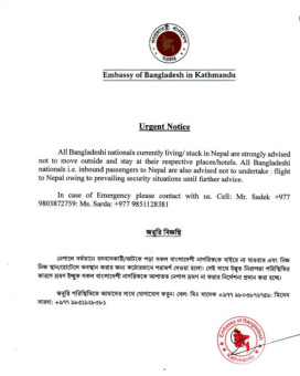 একইসঙ্গে বিদ্যমান পরিস্থিতির কারণে বাংলাদেশি নাগরিকদের নেপাল ভ্রমণে না যাওয়ারও পরামর্শ দেওয়া হয়েছে। এছাড়া জরুরি পরিস্থিতিতে বাংলাদেশি নাগরিকদের +৯৭৭ ৯৮০৩৮৭২৭৫৯ ও +৯৭৭ ৯৮৫১১২৮৩৮১ নাম্বারে যোগাযোগের পরামর্শ দেওয়া হয়েছে।