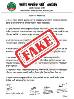 এদিকে, ‘জুলাই সনদ অঙ্গীকারনামা’ শিরোনামে ফেসবুকে ছড়িয়ে পড়া ভুয়া বিবৃতিতে সাতটি দাবি তুলে ধরা হয়। সেগুলো হলো-